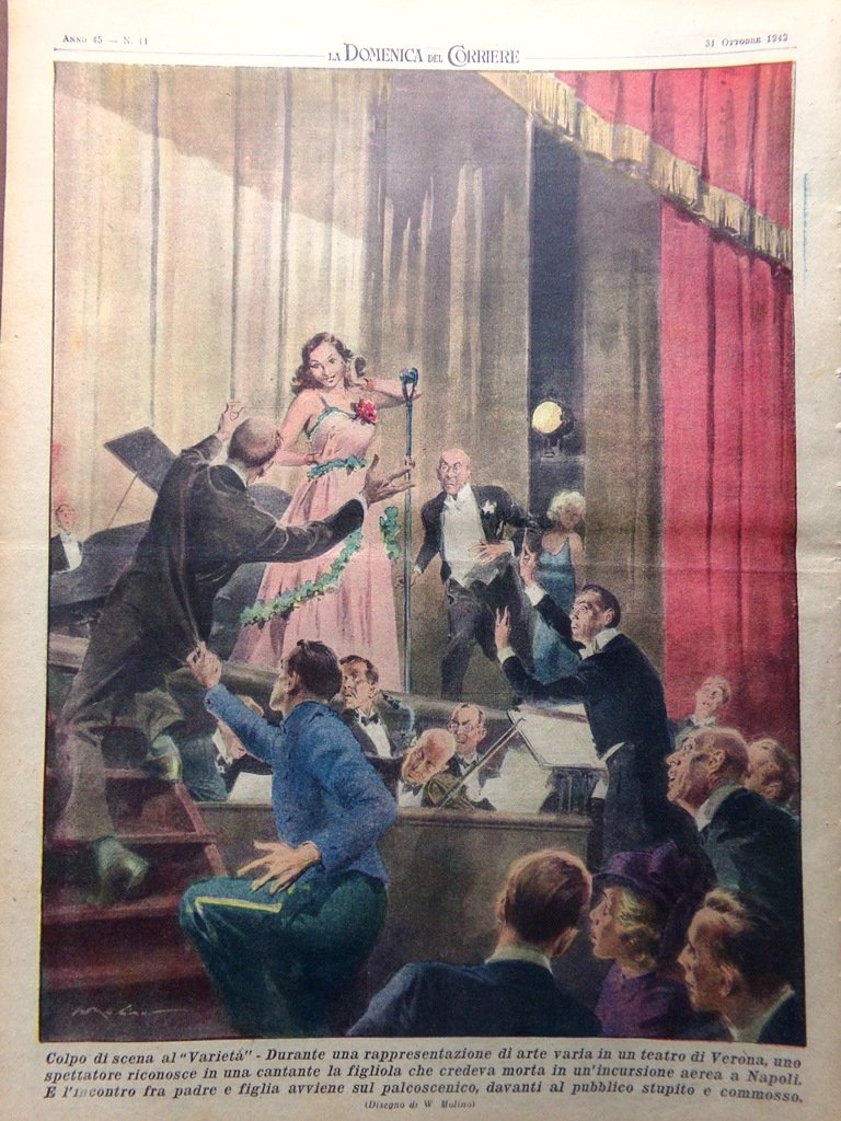 Colpo di scena al "Varietà". Durante una rappresentazione di arte varia in un teatro di Verona, uno spettatore riconosce in una cantante la figliola che credeva morta in un'incursione aerea a Napoli. E l'incontro fra padre e figlia avviene sul palcoscenico, davanti al pubblico stupito e commosso (Walter Molino)