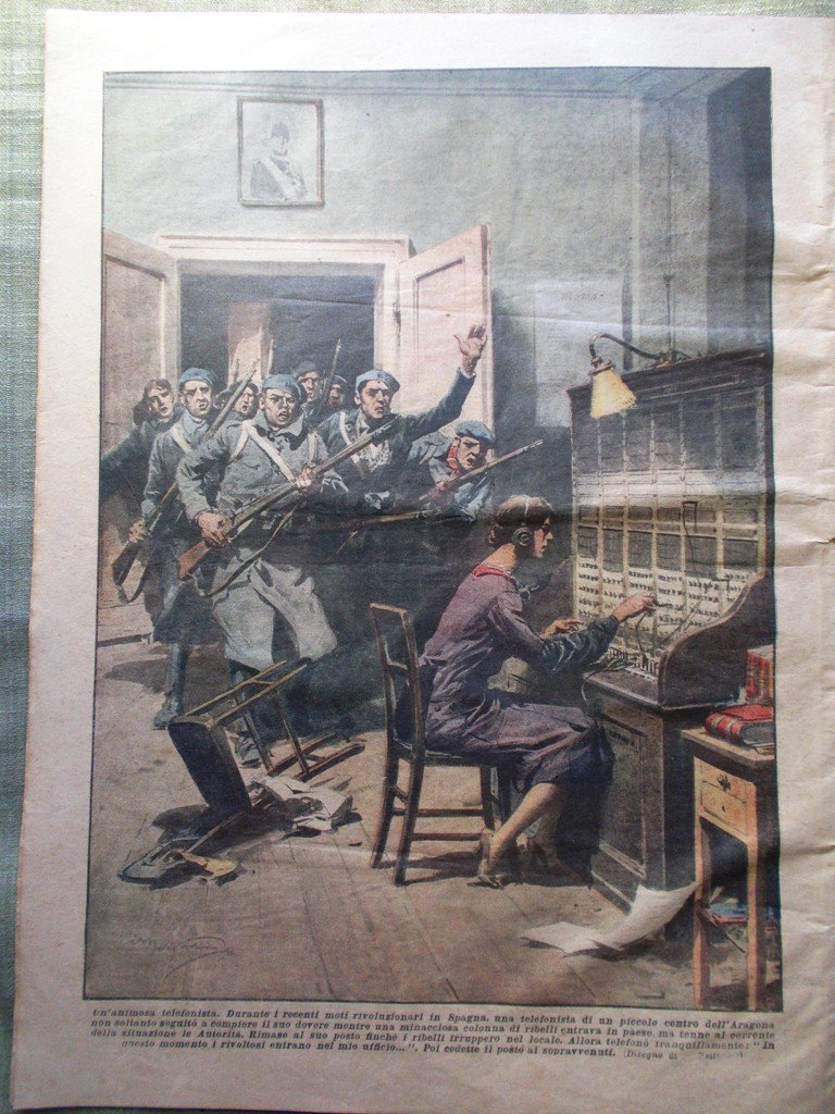 Durante i recenti moti rivoluzionari in Spagna, una telefonista di un piccolo centro dell'Aragona non soltanto seguitò a compiere il suo dovere mentre una minacciosa colonna di ribelli entrava in paese, ma tenne al corrente di quella situazione le autorità. Rimase al suo posto finché i ribelli irruppero nel locale, poi cedette il posto ai sopravvenuti (Achille Beltrame)