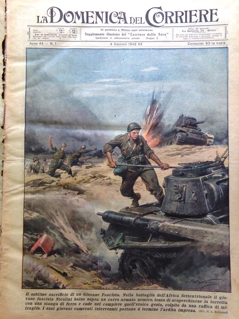 Il sublime sacrificio di un Giovane Fascista. Nella battaglia dell'Africa Settentrionale il giovane fascista Nicolini balza sopra un carro armato nemico, tenta di scoperchiarne la torretta con una stanga di ferro e cade nel compiere quell'eroico gesto, colpito da una raffica di mitraglia. I suoi giovani camerati intervenuti portano a termine l'ardita impresa (Achille Beltrame)