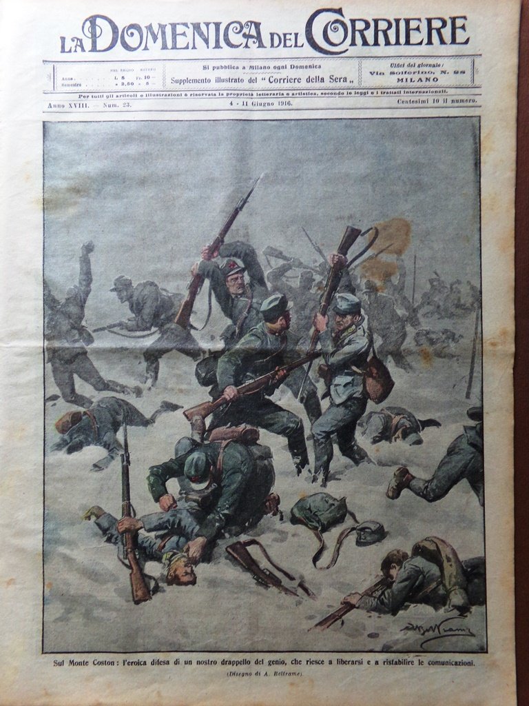 LA DOMENICA DEL CORRIERE Rivista Originale del 4 Giugno 1916 Anno 18 nr. 23 pagine: 16 dimensioni: 38 x 28 cm IN PRIMA PAGINA: Sul monte Coston: l'eroica difesa di un nostro drappello del genio che riesce a liberarsi e a ristabilire le comunicazioni (Achille Beltrame) NELL'ULTIMA PAGINA: A quel prezzo si svolge l'offensiva austriaca: gli assalitori falciati dal nostro fuoco, nel Trentino (Achille Beltrame) ALL'INTERNO: Il servizio telegrafico in guerra Centenari: la morte di Giovanni Paisiello Decorati al valore La grande manifestazione di Roma nell'anniversario della dichiarazione di guerra Il futuro re d'Italia in zona di guerra I soldati russi in Francia La lotta nostra: combattenti e luoghi: Monfalcone, Adamello CONDIZIONI DELLA RIVISTA: BUONE, NORMALI SEGNI DEL TEMPO, SOVRACOPERTINE MANCANTI NOTE PARTICOLARI: PICCOLI STRAPPETTI NEI BORDI IN ALCUNE PAGINE, LEGGERE MACCHIE SULLA COPERTINA (V. FOTO)