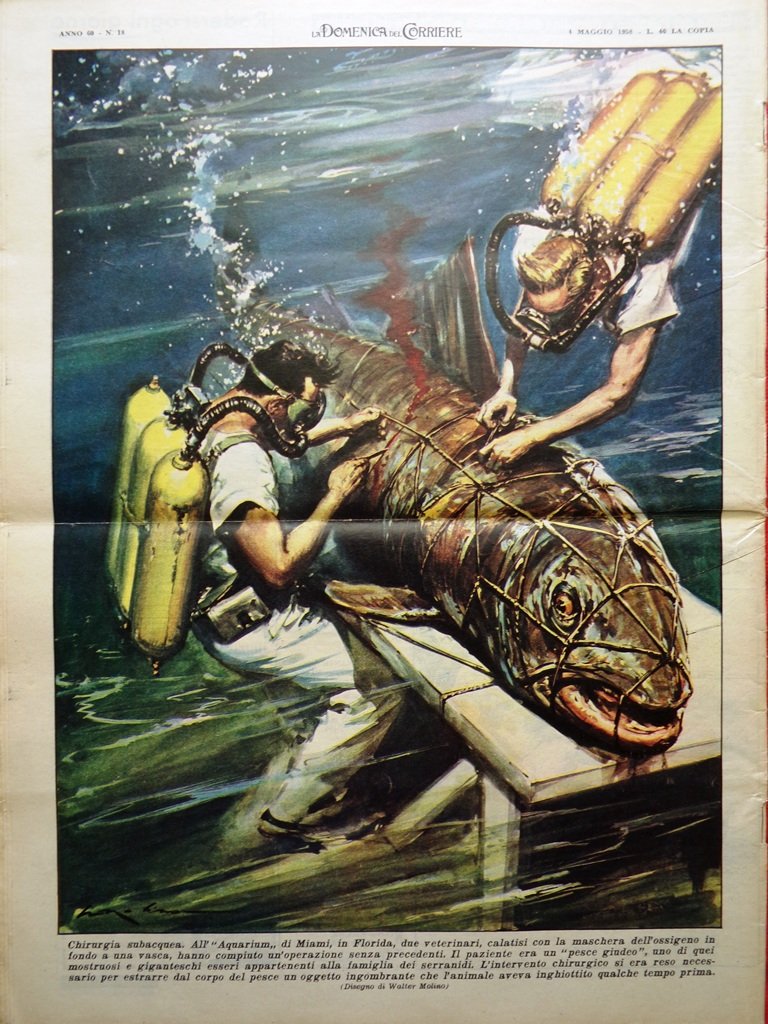All' "Aquarium" di Miami, in Florida, due veterinari, calatesi con la maschera dell'ossigeno in fondo a una vasca, hanno compiuto un'operazione senza precedenti. Il paziente era un "pesce giudeo", appartenenti alla famiglia dei serranidi (Walter Molino)