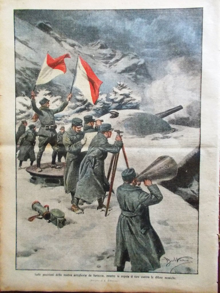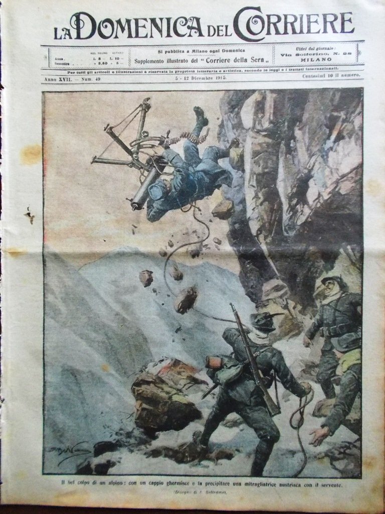 LA DOMENICA DEL CORRIERE Rivista Originale del 5 Dicembre 1915 Anno 17 nr. 49 pagine: 16 dimensioni: 38 x 28 cm IN PRIMA PAGINA: Il bel colpo di un alpino: con un cappio ghermisce e fa precipitare una mitragliatrice austriaca con il servente (Achille Beltrame) NELL'ULTIMA PAGINA: Sulle posizioni della nostra artiglieria da fortezza, mentre si regola il tiro contro le difese nemiche (Achille Beltrame) ALL'INTERNO: Furono eroi per la Patria (fotografie) Personalità in grigio-verde Tre medaglie al valore: Domenico Amici, Giuseppe Paolini, Enrico Visetti In fuga attraverso il deserto: Angelo Lopez, Franco di Filippo, Giuseppe Vollino Le difese superate per la conquista del San Michele Granatieri di Sardegna Un'eroina russa: Rimma Michailovna Ivanova CONDIZIONI DELLA RIVISTA: BUONE, NORMALI SEGNI DEL TEMPO, SOVRACOPERTINE MANCANTI NOTE PARTICOLARI: LEGGERE MACCHIE DEL TEMPO IN ALCUNE PAGINE