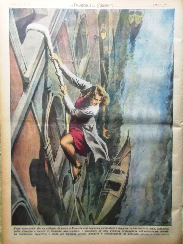 Da un collegio di suore a Venezia una ragazza piemontese è fuggita, in una notte di luna, calandosi dalla finestra a mezzo di lenzuola attorcigliate e passando su una gondola ormeggiata nel sottostante canale (Walter Molino)