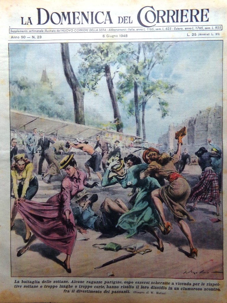 La battaglia delle sottane. Alcune ragazze parigine, dopo essersi schernite a vicenda per le rispettive sottane o troppo lunghe o troppo corte, hanno risolto il loro dissidio in un clamoroso scontro, fra il divertimento dei passanti (Walter Molino)