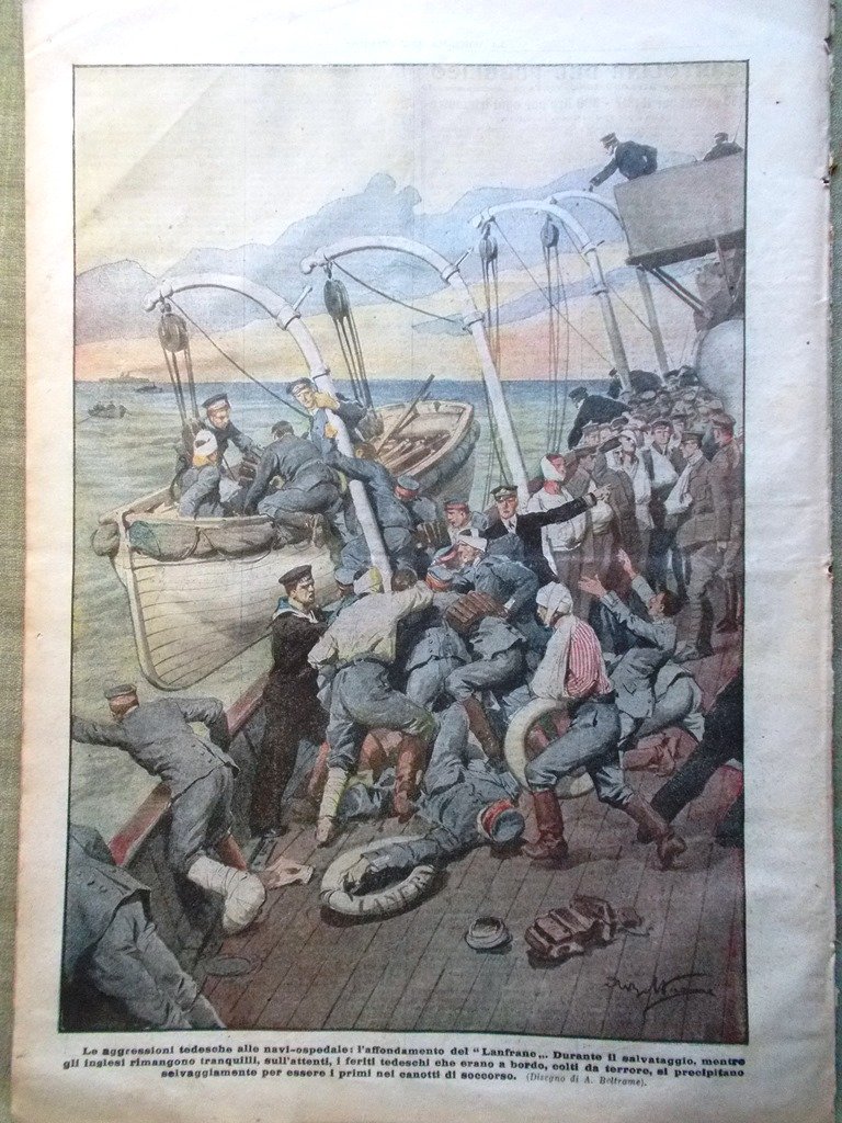 Le aggressioni tedesche alle navi-ospedale: l'affondamento del "Lanfranc". Durante il salvataggio, mentre gli inglesi rimangono tranquilli, sull'attenti, i feriti tedeschi che erano a bordo, colti da terrore, si precipitano selvaggiamente per essere i primi nei canotti di soccorso (Achille Beltrame)