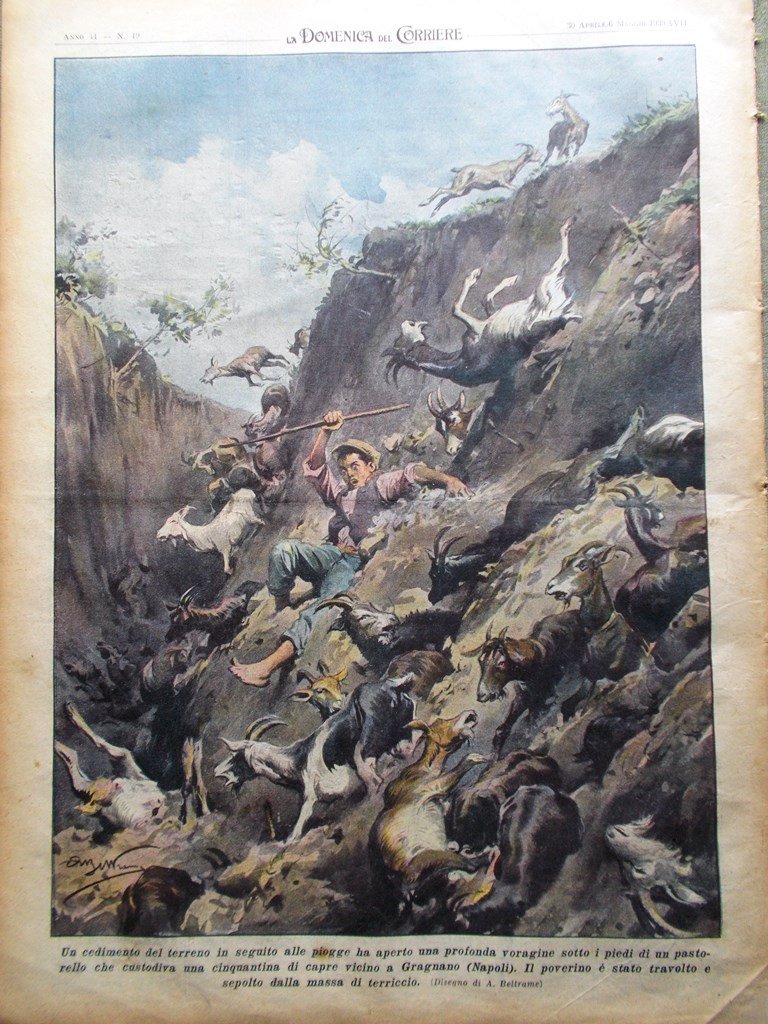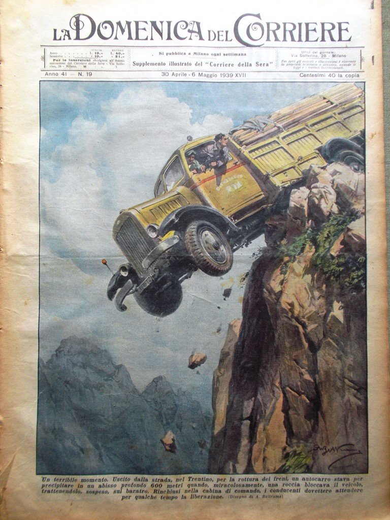 Uscito dalla strada, nel Trentino, per la rottura dei freni, un autocarro stava per precipitare in un abisso profondo 600 metri quando, miracolosamente, una roccia bloccava il veicolo, trattenendolo sospeso sul baratro. Rinchiusi nella cabina di comando i conducenti dovettero attendere per qualche tempo la liberazione (Achille Beltrame)