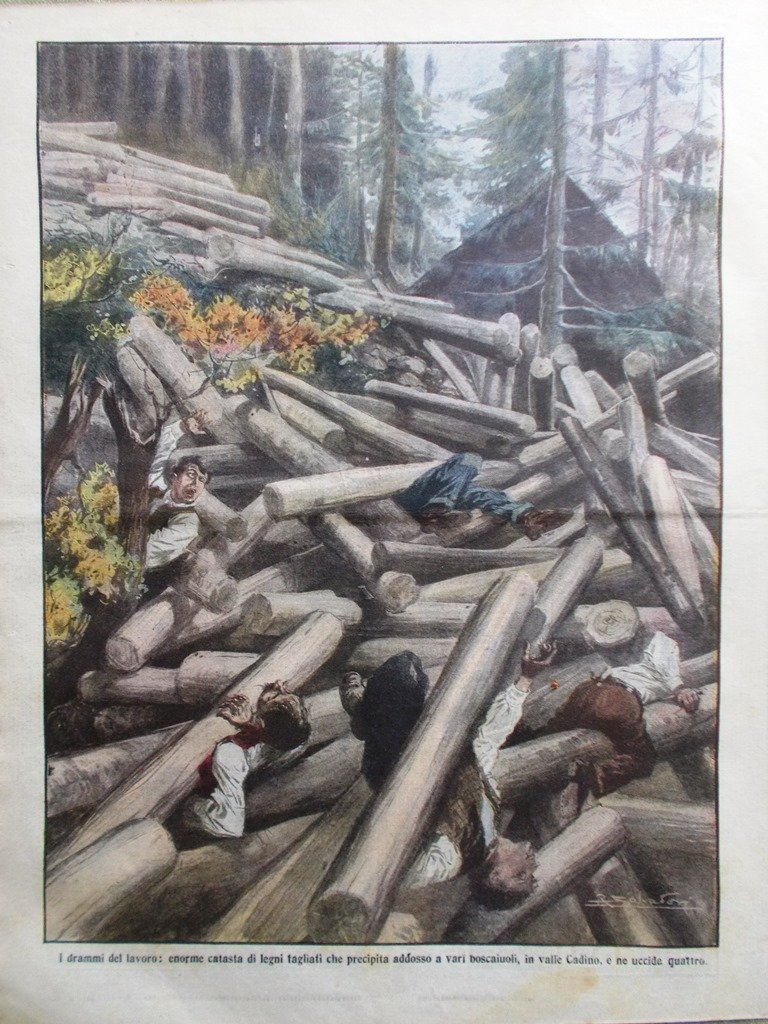 I drammi del lavoro: enorme catasta di legni tagliati che precipita addosso a vari boscaiuoli, in valle Cadin, e ne uccide quattro (Achille Beltrame)