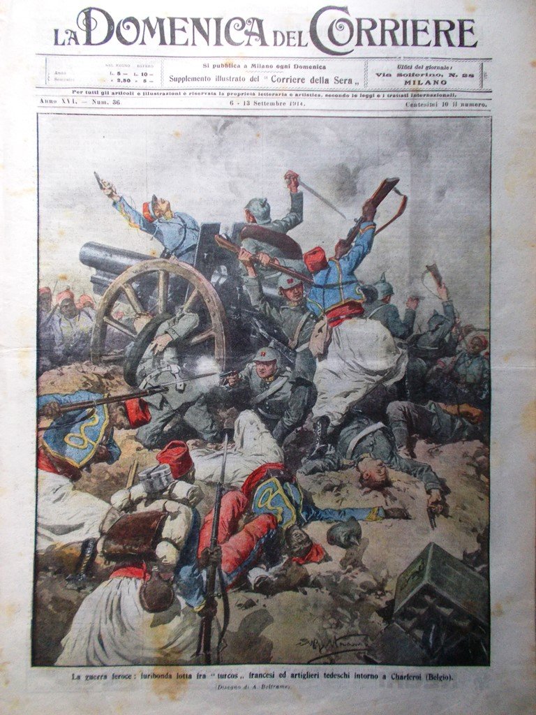 La guerra feroce: furibonda lotta fra "turcos" francesi ed artiglieri tedeschi intorno a Charleroi (Belgio) (Achille Beltrame)