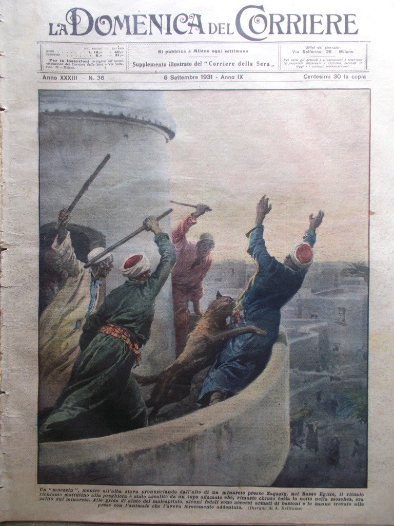 Un "muezzin" mentre all'alba stava pronunciando dall'alto di un minareto presso Zagazig, nel Basso Egitto, il rituale richiamo mattutino alla preghiera è stato assalito da un lupo affamato che, rimasto chiuso tutta la notte nella moschea era salito sul minareto. Alle grida di aiuto del malcapitato alcuni fedeli sono accorsi armati di bastoni e lo hanno trovato alle prese con l'animale che l'aveva ferocemente addentato (Achille Beltrame)