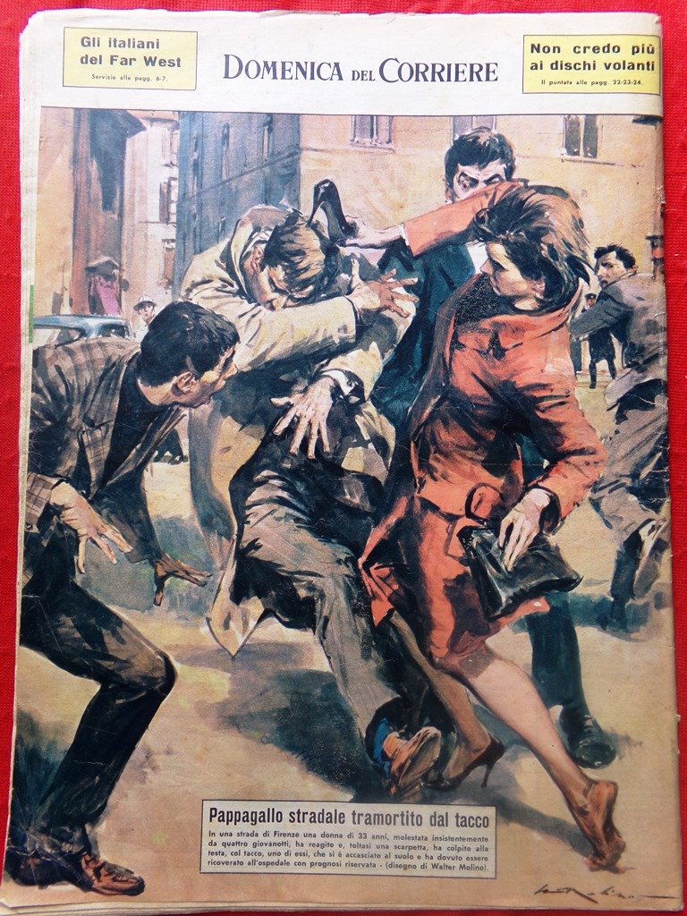In una strada di Firenze una donna di 33 anni, molestata insistentemente da quattro giovanotti, ha reagito e, toltasi una scarpetta, ha colpito alla testa, col tacco, uno di essi che si è accasciato al suolo e ha dovuto essere ricoverato all'ospedale con prognosi riservata (Walter molino)