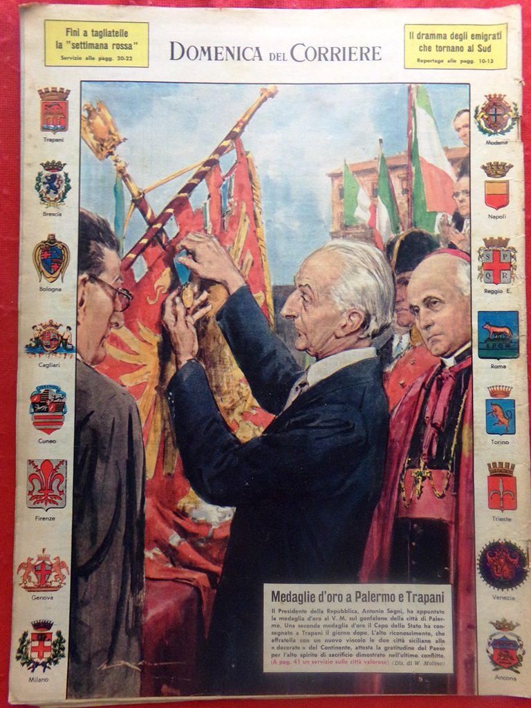 Il presidente della repubblica Antonio Segni ha appuntato la medaglia d'oro al valor militare sul gonfalone della città di Palermo. Una seconda medaglia d'oro stata consegnata a Trapani il giorno dopo. Il riconoscimento attesta la gratitudine del Paese per l'alto spirito di sacrificio dimostrato nell'ultimo conflitto (Walter Molino)