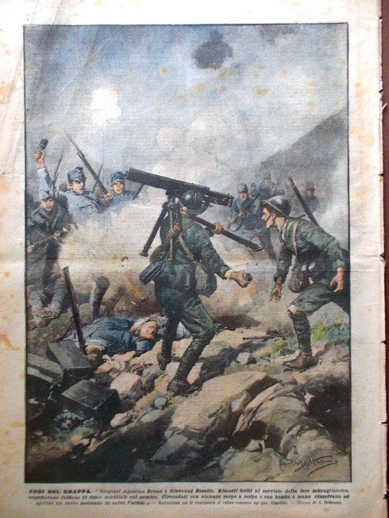 Eroi del Grappa: "Sergenti Agostino Bruno e Giovanni Borello. Rimasti feriti al servizio della loro mitragliatrice seguitavano raffiche di fuoco micidiale sul nemico. Circondati con violento corpo e corpo e con bombe a mano riuscivano ad aprirsi un varco mettendo in salvo l'arma" (Achille Beltrame)