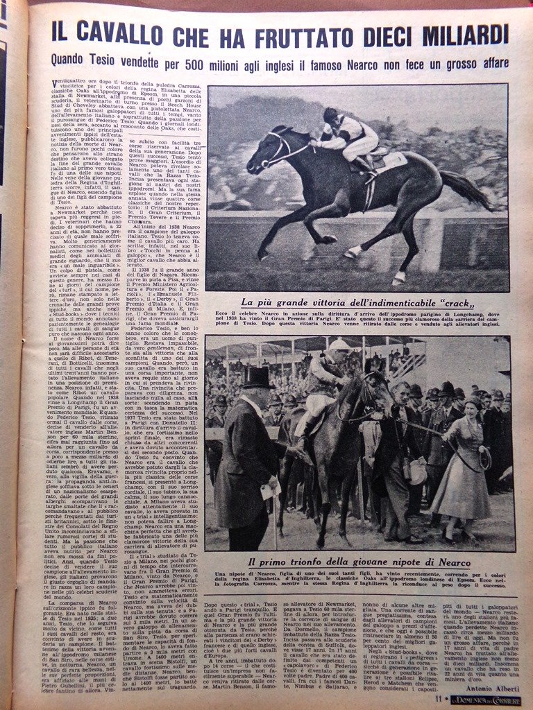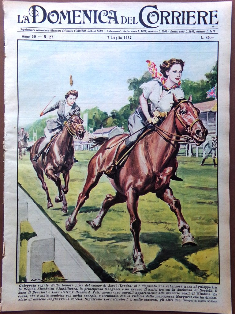 Galoppata regale. Sulla famosa pista del campo di Ascot (Londra) si è disputata una scherzosa gara al galoppo tra la Regina Elisabetta d'Inghilterra, la principessa Margaret e un gruppo di amici tra cui la duchessa di Norfolk, il duca di Beaufort e Lord Patrick Bersford (Walter Molino)