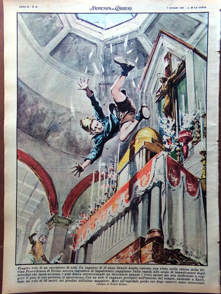 Un ragazzo di 11 anni, Orazio Losito, entrato, non visto, nella chiesa della Divina Provvidenza di Torino, ancora ingombra di impalcature, raggiunse l'alta cupola allo scopo di impadronirsi degli uccellini che lassù avevano i nidi. Stava attraversando un lucernario quando i vetri, spessi ma non sufficienti a reggere il peso di una persona, si spezzarono. Con un urlo il ragazzo precipitò nell'interno del tempio, andando a finire, dopo un volo di 16 metri, sui gradini dell'altar maggiore. Morì all'ospedale poche ore dopo esservi stato ricoverato (Walter Molino)