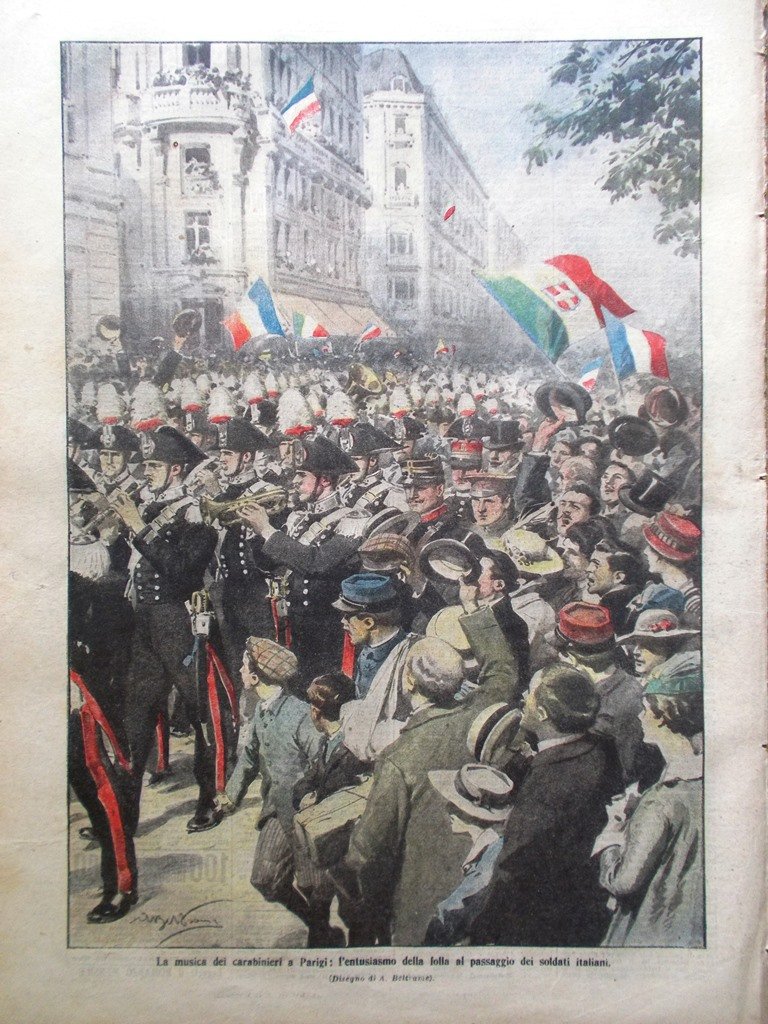 LA DOMENICA DEL CORRIERE Rivista Originale del 7 Maggio 1916 Anno 18 nr. 19 pagine: 16 dimensioni: 39 x 28 cm IN PRIMA PAGINA: La guerra di trincea sul Carso: l'effetto dei nostri esplosivi sulle posizioni nemiche (Achille Beltrame) NELL'ULTIMA PAGINA: La musica dei carabinieri a Parigi: l'entusiasmo della folla al passaggio dei soldati italiani (Achille Beltrame) ALL'INTERNO: Per rintracciare i proiettili inesplosi Una trovata geniale della Croce Rossa Decorati al valore I nostri principi tra i "ragazzi esploratori" a Roma L'audace sbarco di quattro aviatori Madrid: dove non si fa la guerra I russi in Francia Sulla cresta conquistata del Col di Lana CONDIZIONI DELLA RIVISTA: MOLTO BUONE, NORMALI SEGNI DEL TEMPO, SOVRACOPERTINE ASSENTI NOTE PARTICOLARI: NESSUNA