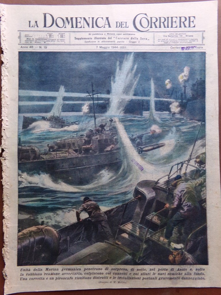 Unità della Marina germanica penetrano di sorpresa di notte nel porto di Anzio e, sotto la rabbiosa reazione avversaria, colpiscono coi cannoni e coi siluri le navi nemiche alla fonda. Una corvetta e un piroscafo risultano distrutti e le installazioni portuali gravemente danneggiate (Walter Molino)