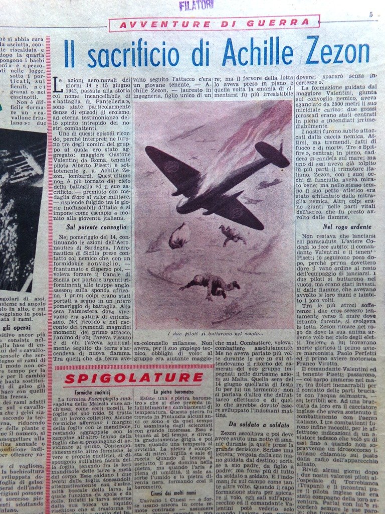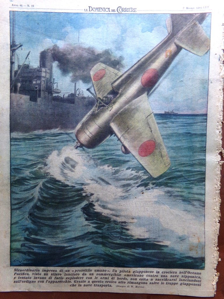 Straordinaria impresa di un "proiettile umano". Un pilota giapponese in crociera nell'Oceano Pacifico, visto un siluro lanciato da un sommergibile americano contro una nave nipponica, e tentato invano di farlo esplodere con le armi di bordo, non esita a sacrificarsi lanciandosi sull'ordigno con l'apparecchio. Grazie a questo eroico atto rimangono salve le truppe giapponesi che la nave trasporta (Walter Molino)