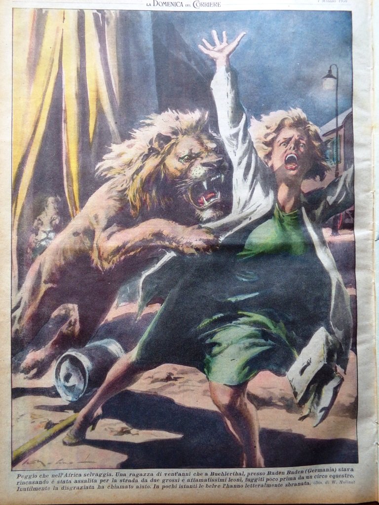 Peggio che nell'Africa selvaggia. Una ragazza di 20 anni che a Buehlerthal, presso Baden Baden (Germania) stava rincasando è stata assalita per la strada da due grossi leoni, fuggiti poco prima da un circo equestre. Inutilmente la disgraziata ha chiamato aiuto (Walter Molino)