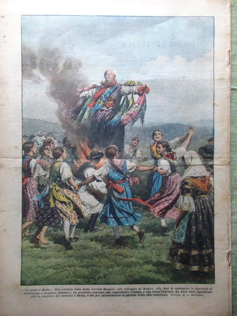 "L'estate è finita". Una curiosa festa nella vecchia Boemia: nel villaggio di Zaskov, alla fine di settembre, le fanciulle si riuniscono e danzano attorno a un grottesco pupazzo che rappresenta l'estate e che viene bruciato (Achille Beltrame)
