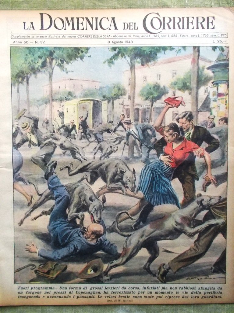 Una torma di grossi levrieri da corsa, infuriati ma non rabbiosi, sfuggita da un furgone nei pressi di Copenaghen, ha terrorizzato per un momento le vie della periferia inseguendo e azzannando i passanti. Le veloci bestie sono state poi riprese dai loro guardiani (Walter Molino)