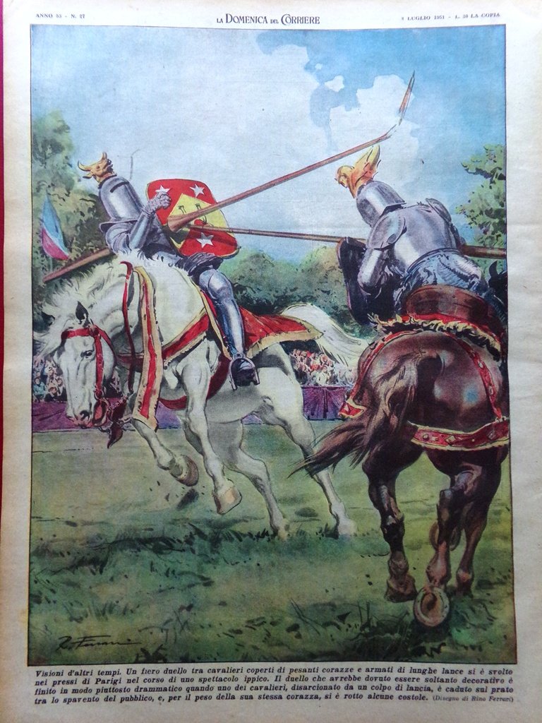 Un fiero duello tra cavalieri coperti di pesanti corazze e armati di lunghe lance si è svolto nei pressi di Parigi nel corso di uno spettacolo ippico. Il duello che avrebbe dovuto essere soltanto decorativo è finito in modo drammatico quando uno dei cavalieri, disarcionato da un colpo di lancia, è caduto sul prato tra lo spavento del pubblico, e, per il peso della sua stessa corazza si è rotto alcune costole (Rino Ferrari)