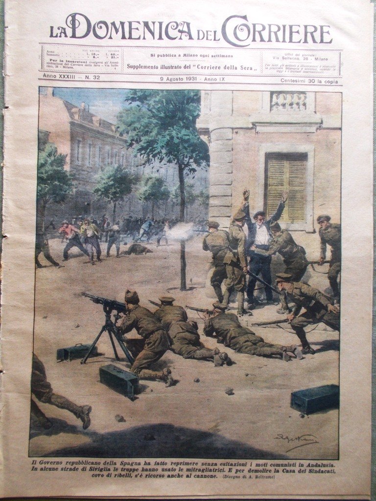 Il Governo repubblicano della Spagna ha fatto reprimere senza esitazioni i moti comunisti in Andalusia. In alcune strade di Siviglia le truppe hanno usato le mitragliatrici. E per demolire la Casa dei Sindacati, covo di ribelli, s'è ricorso anche al cannone (Achille Beltrame)