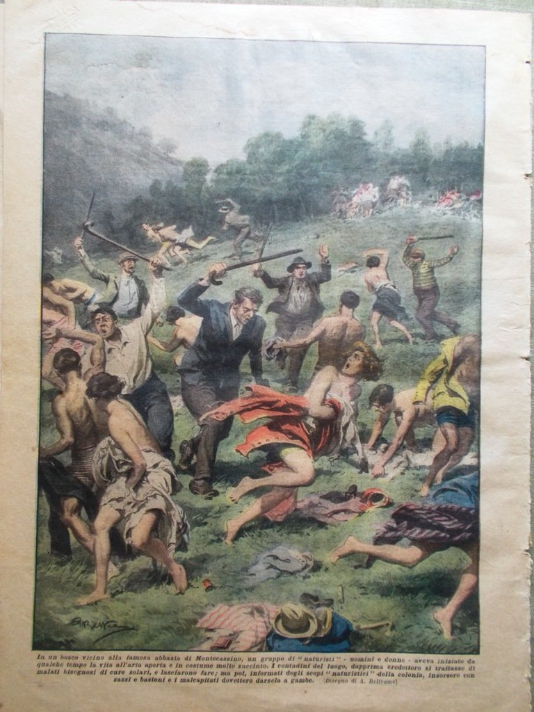 In un bosco vicino la famosa abbazia di Montecassino, un gruppo di "naturisti", uomini e donne, aveva iniziato da qualche tempo la vita all'aria aperta e in costume molto succinto. I contadini del luogo, informati degli scopi "naturistici" della colonia insorsero con sassi e bastoni e i malcapitati dovettero darsela a gambe (Achille Beltrame)