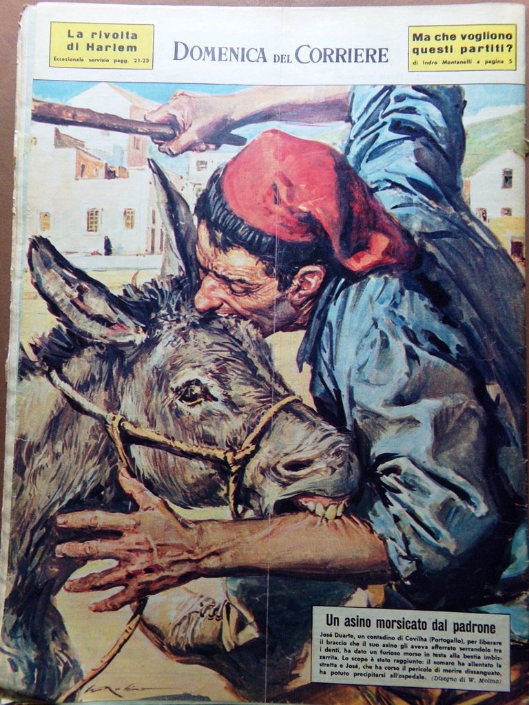 José Duarte, un contadino di Covilha (Portogallo), per liberare il braccio che il suo asino gli aveva afferrato con i denti, ha dato un furioso morso in testa alla bestia imbizzarrita. Il somaro ha allentato la stretta e José ha potuto precipitarsi all'ospedale (Walter Molino)