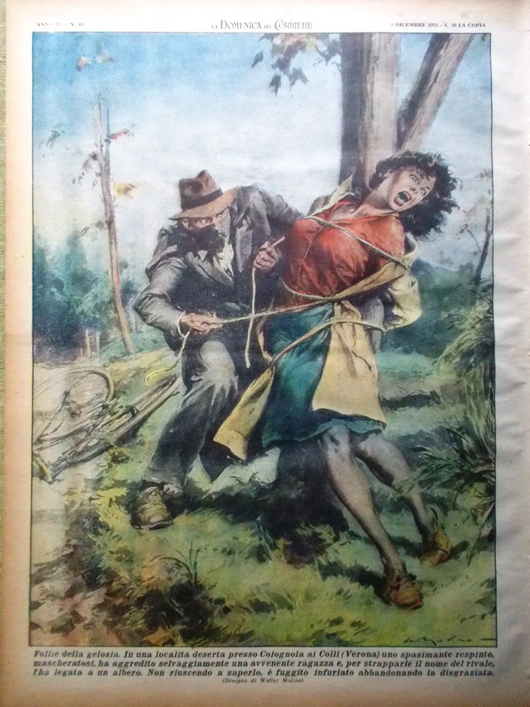 In una località deserta presso Colognola ai Colli (Verona) uno spasimante respinto mascheratosi ha aggredito una ragazza e, per strapparle il nome del rivale, l'ha legata a un albero. Non riuscendo a saperlo è fuggito infuriato abbandonando la disgraziata (Walter Molino)