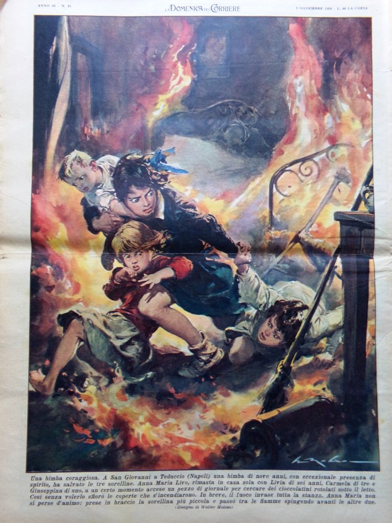 A San Giovanni a Teduccio (Napoli) una bimba di nove anni, ha salvato le tre sorelline. Anna Maria Livo, rimasta sola in casa con Livia di sei anni, Carmela di tre e Giuseppina di uno, a un certo momento accese un pezzo di giornale per cercare dei cioccolatini rotolati sotto il letto sfiorando le coperte che s'incendiarono. In breve, il fuoco invase tutta la stanza ma Anna Maria prese in braccio la sorellina più piccola e passò tra le fiamme spingendo avanti le altre due (Walter Molino)