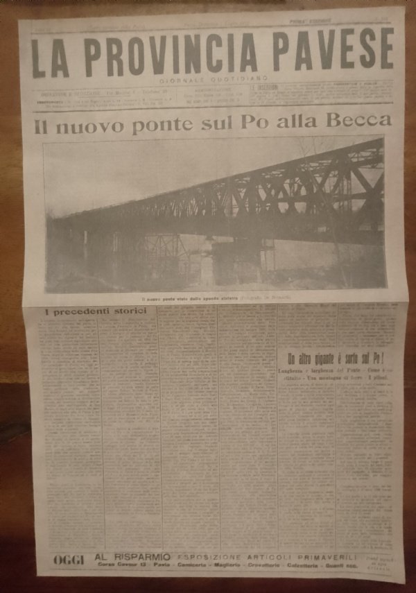 La Provincia Pavese. Il nuovo ponte sul Po alla Becca - FACSIMILE PRIMA PAGINA 7 LUGLIO 1912