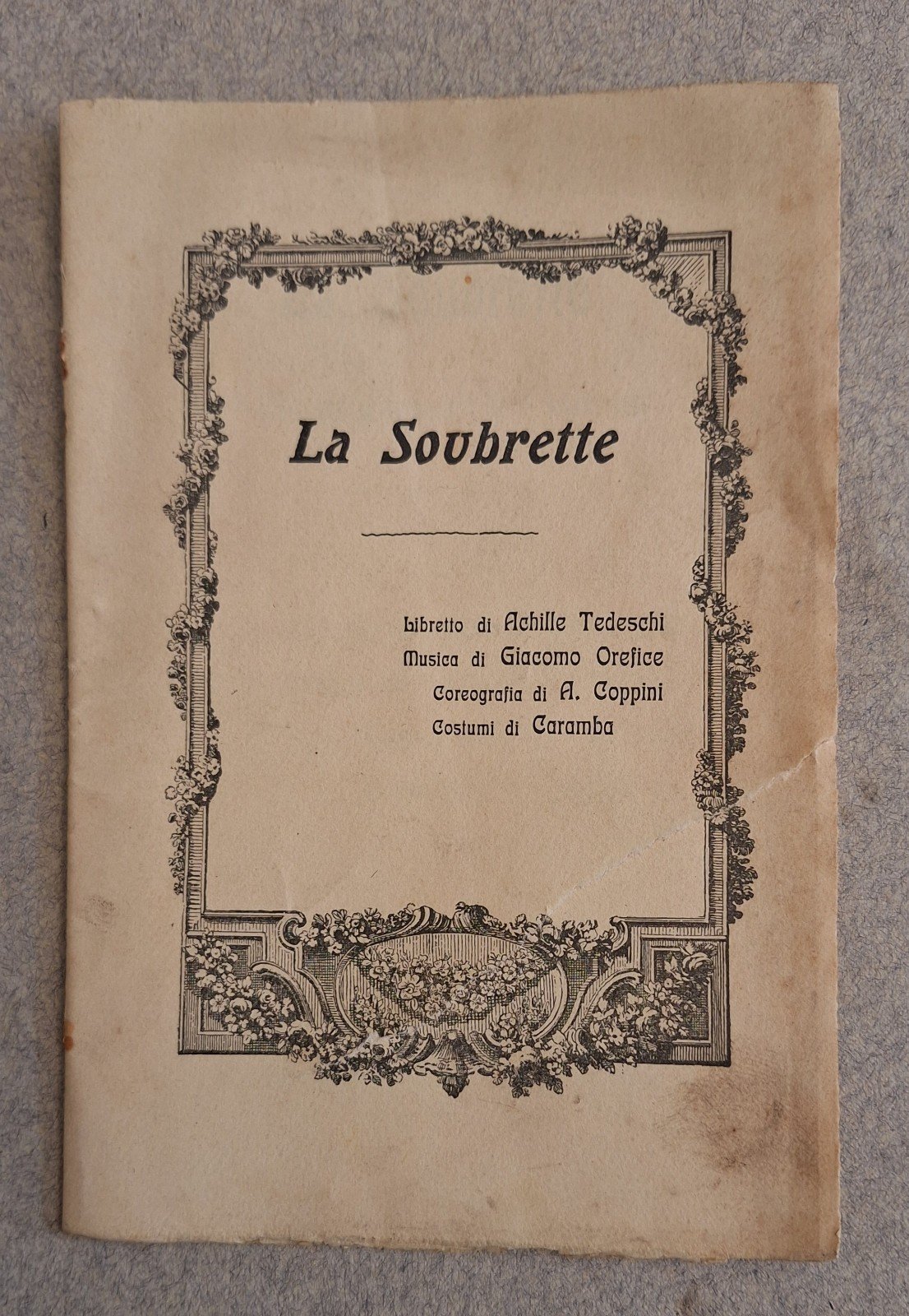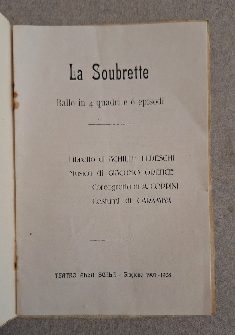 LA SOUBRETTE BALLO IN 4 QUADRI A. TEDESCHI G. OREFICE TEATRO ALLA SCALA 1907Cm. 17 x 11, legatura editoriale.Lievissimi segni e strappo alla copertina, pagine fresche e pulite.TUTTI I NOSTRI LIBRI SONO VISIBILI PREVIO CONTATTO MAIL, TELEFONO O WHATSAPP NELLA NUOVA SEDE DI MILANO: LIBRERIA COSMOPOLIS, VIA JOMMELLI 22, MILANO.3313109672