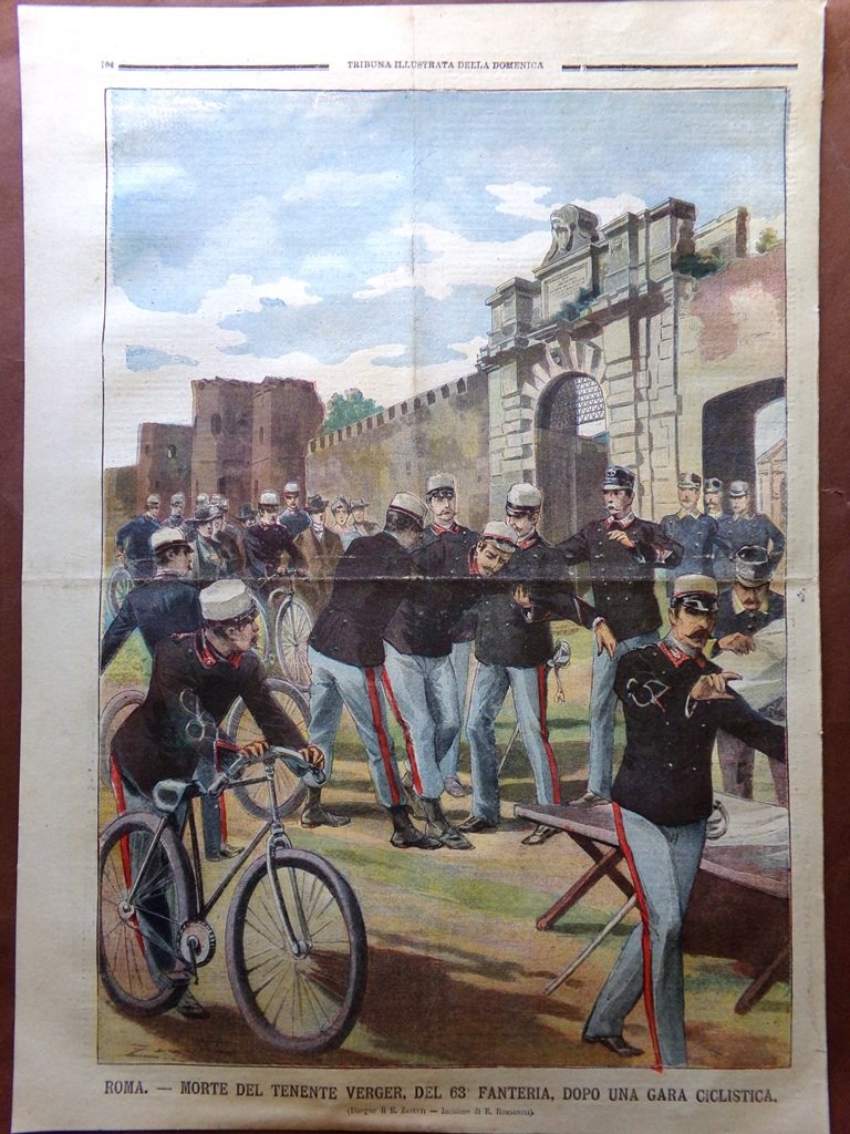 Roma: morte del tenente Verger, del 63° fanteria, dopo una gara ciclistica (disegno di E. Zanetti)