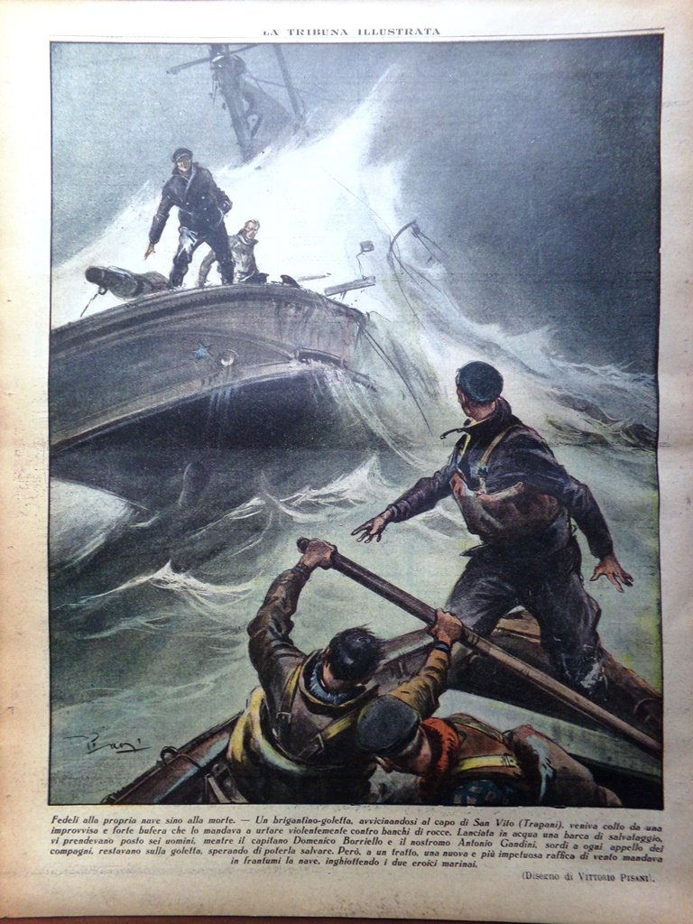 Fedeli alla propria nave sino alla morte. Un brigantino-goletta, avvicinandosi al capo di San Vito (Trapani) veniva colto da una improvvisa e forte bufera che lo mandava a urtare violentemente contro banchi di rocce. Lanciata in acqua una barca di salvataggio, vi prendevano posto sei uomini, mentre il capitano Domenico Borriello e il nostromo Antonio Gandini, sordi a ogni appello dei compagni, restavano sulla goletta, sperando di poterla salvare. Però a un tratto una nuova e più impetuosa raffica di vento mandava in frantumi la nave, inghiottendo i due eroici marinai (disegno di Vittorio Pisani)