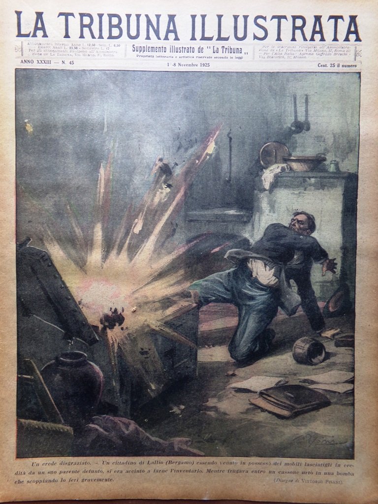 Un cittadino di Lallio (Bergamo) essendo venuto in possesso dei mobili lasciatigli in eredità da un parente defunto si era accinto a farne l'inventario, ma una bomba dentro un cassone scoppiò e lo ferì gravemente (disegno di Vittorio Pisani)