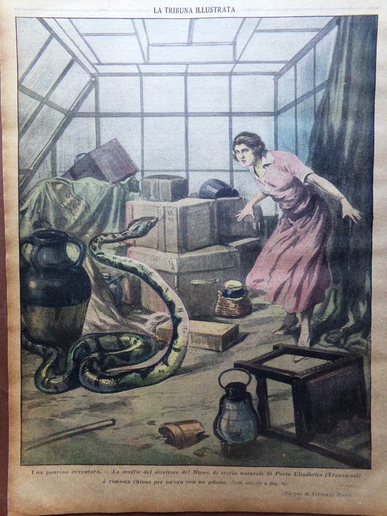 La moglie del direttore del museo di Porto Elisabetta (Transvaal) è rimasta chiusa per un'ora con un pitone (disegno di Vittorio Pisani)