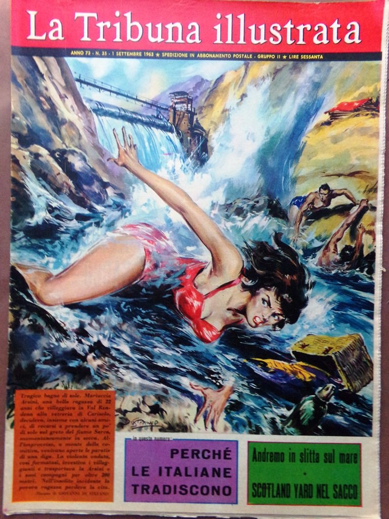 Tragico bagno di sole. Mariuccia Arsini una bella ragazza di 22 anni che villeggiava in Val Rendena alla vetreria di Carisolo, decideva insieme con alcuni amici di recarsi a prendere un po' di sole sul greto del fiume Sarca, momentaneamente in secca. All'improvviso, a monte della comitiva venivano aperte le paratie di una diga. La violenta ondata, così formatasi, investiva i villeggianti e trasportava la Arsini e i suoi compagni per oltre 200 metri. Nell'insolito incidente la povera ragazza perdeva la vita (disegno di G. Di Stefano)