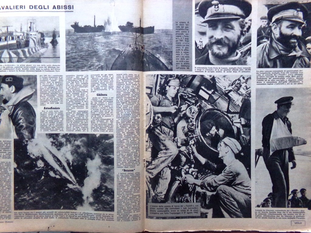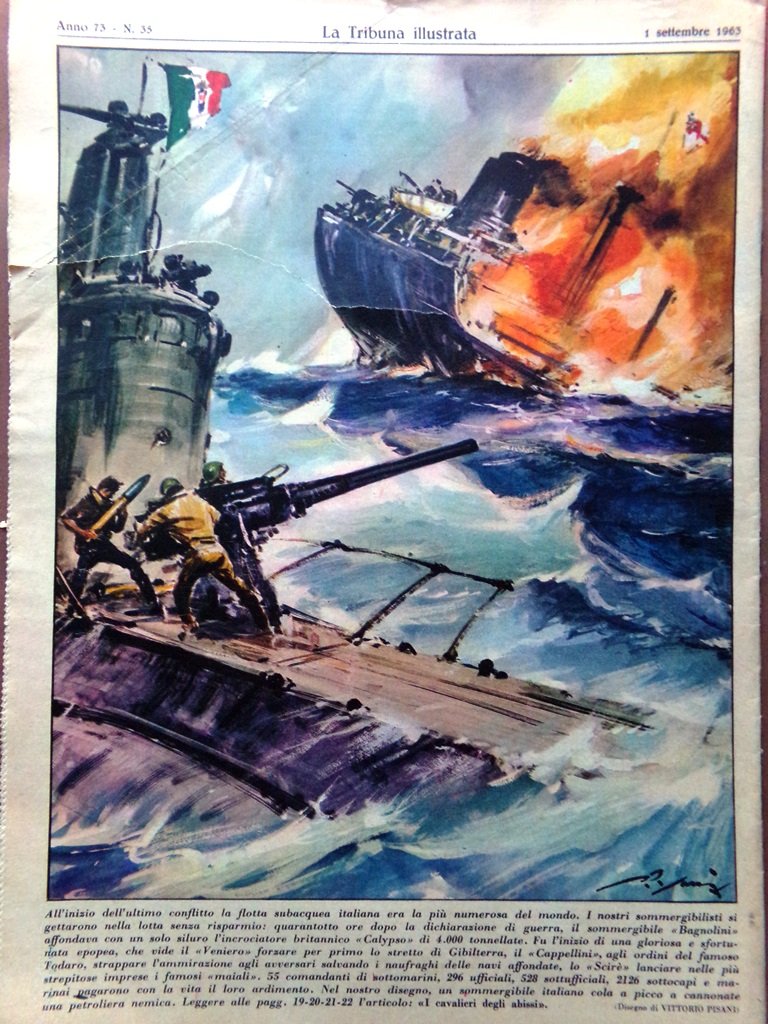 All'inizio dell'ultimo conflitto la flotta subacquea italiana era la più numerosa del mondo. I nostri sommergibilisti si gettarono nella lotta senza risparmio: quarantotto ore dopo la dichiarazione di guerra, il sommergibile "Bagnolini" affondava con un solo siluro l'incrociatore britannico "Calypso" di 4.000 tonnellate. Fu l'inizio di una gloriosa e sfortunata epopea, che vide il "Veniero" forzare per primo lo stretto di Gibilterra, il "Cappellini" agli ordini del famoso Todaro, strappare l'ammirazione agli avversari salvando i naufraghi delle navi affondate, lo "Scirè" lanciare nelle più strepitose imprese i famosi "maiali". 55 comandanti di sottomarini, 296 ufficiali, 528 sottufficiali, 2126 sottocapi e marinai pagarono con la vita il loro ardimento (disegno di Vittorio Pisani)