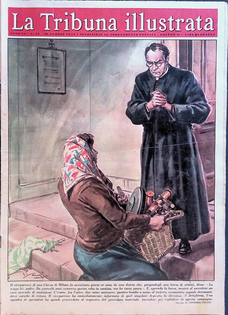 Il viceparroco di una Chiesa di Milano fu avvicinato giorni or sono da una donna che, porgendogli una borsa di vimini, disse: « La tenga lei. padre. Da parecchi anni conservo questa roba in cantina, ma ho tanta paura ». E, aprendo la borsa, mostrò al sacerdote un vero arsenale di munizioni. C'erano, fra l'altro, due mine anticarro, quattro bombe a mano al fosforo, sessantotto capsule detonanti, dicci cariche di tritolo. Il viceparroco ha immediatamente informato di quel singolare deposito la direzione d' Artiglieria. Una squadra di specialisti ha quindi provveduto al sequestro del pericoloso materiale, facendolo poi esplodere in aperta campagna.
