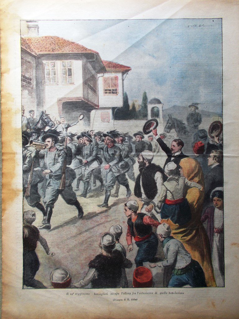 Il 10° reggimento bersaglieri occupa Vallona fra l'entusiasmo della popolazione (disegno di E. Abbo)