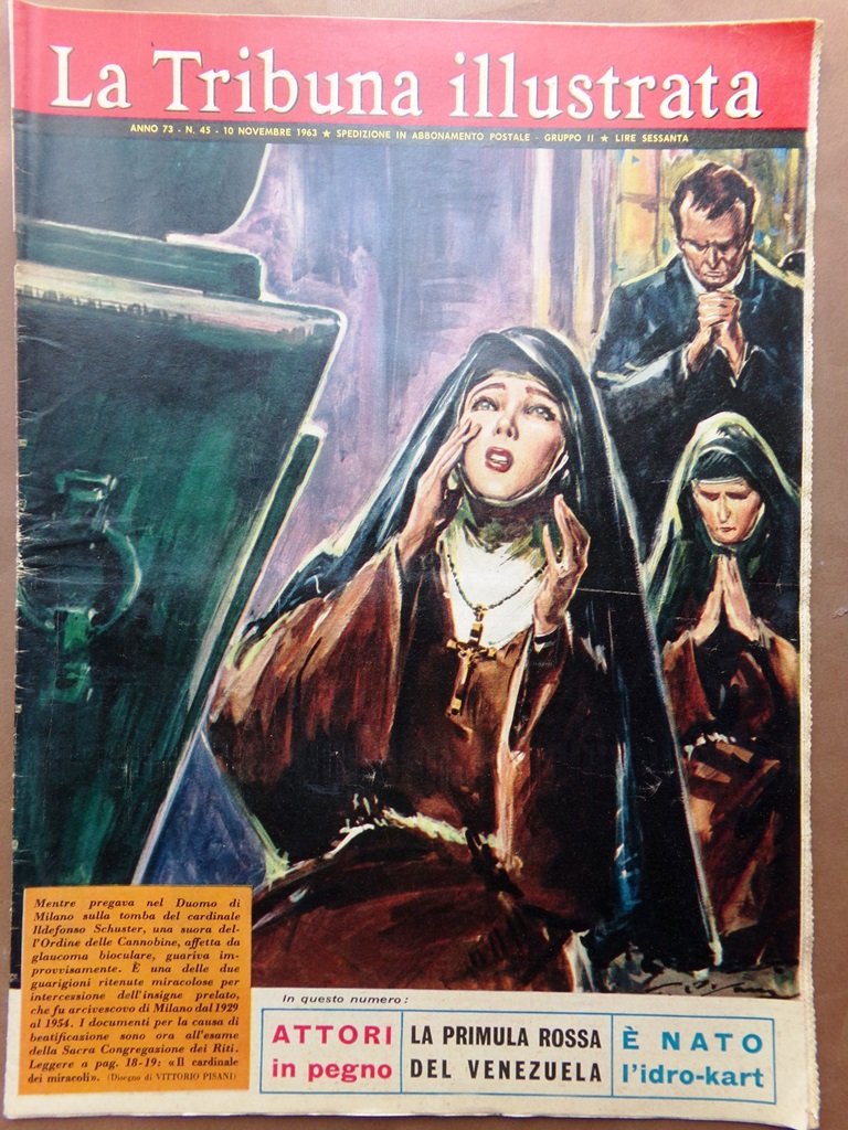 Mentre pregava nel Duomo di Milano sulla tomba del carcinale Ildefonso Schuster, una suora dell'ordine delle Cannobine, affetta da glaucoma bioculare, guariva improvvisamente. È una delle due guarigioni ritenute miracolose per intercessione dell'insigne prelato, che fu arcivescovo di Milano dal 1929 al 1954. I documenti per la causa di beatificazione sono ora all'esame della Sacra Congregazione dei Riti. (disegno di Vittorio Pisani)
