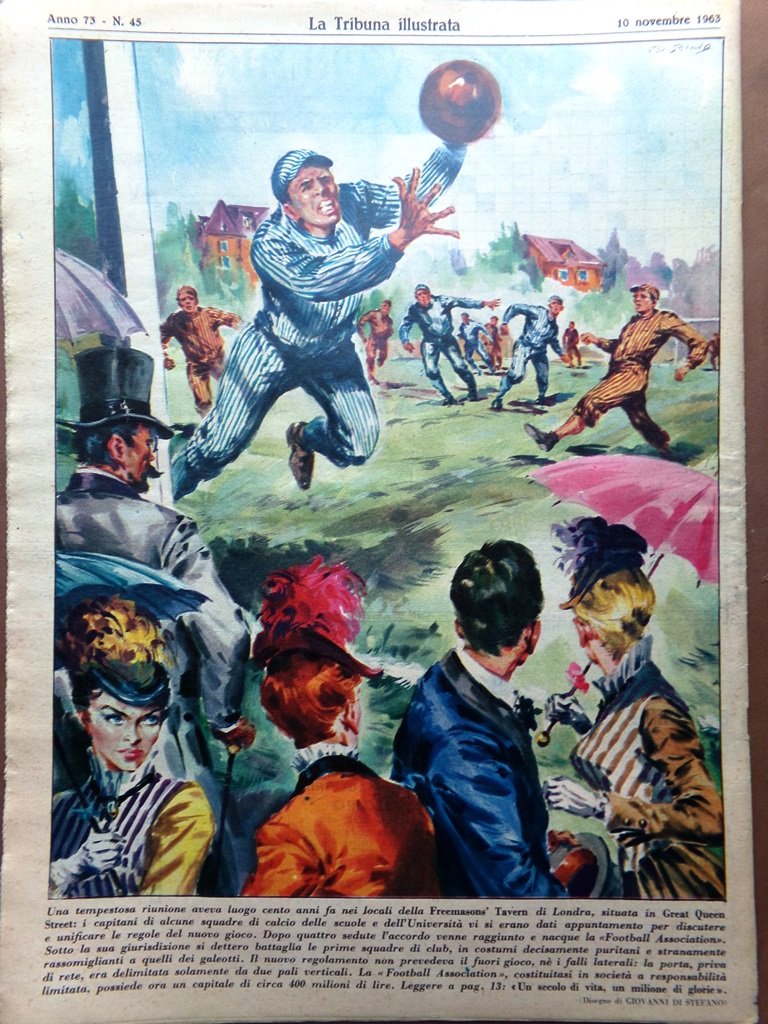 Una tempestosa riunione aveva luogo cento anni fa nei locali della Freemasons' Taver di Londra, situata in Great Queen Street: i capitani di alcune squadre di calcio delle scuole e dell'Università vi si erano dati appuntamento per discutere e unificare le regole del nuovo gioco. Dopo quattro sedute l'accordo venne raggiunto e nacque la "Football Association". Sotto la sua giurisdizione si dettero battaglia le prime squadre di club, in costumi decisamente puritani e stranamente rassomiglianti a quelli dei galeotti. Il nuovo regolamento non prevedeva il fuori gioco, né i falli laterali: la porta, priva di rete, era delimitata solamente da due pali verticali. La "Football Association", costituitasi in società a responsabilità limitata, possiede ora un capitale di circa 400 milioni di lire (disegno di G. Di Stefano)