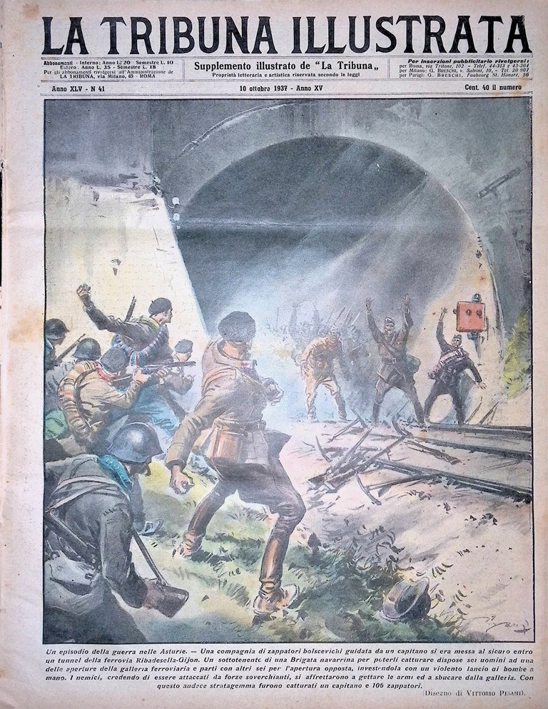 Un episodio della guerra nelle Asturie. Una compagnia di zappatori bolscevichi guidata da un capitano si era messa al sicuro entro un tunnel della ferrovia Ribadesella-Gijon. Un sottotenente di una Brigata navarrina per poterli catturare dispose sei uomini ad una delle aperture della galleria ferroviaria e partì con altri sei per l'apertura opposta, investendola con un violento lancio di bombe a mano. I nemici, credendo di essere attaccati da forze soverchianti, si affrettarono a gettare le armi ed a sbucare dalla galleria. Con questo audace stratagemma furono catturati da un capitano e 106 zappatori (disegno di Vittorio Pisani)
