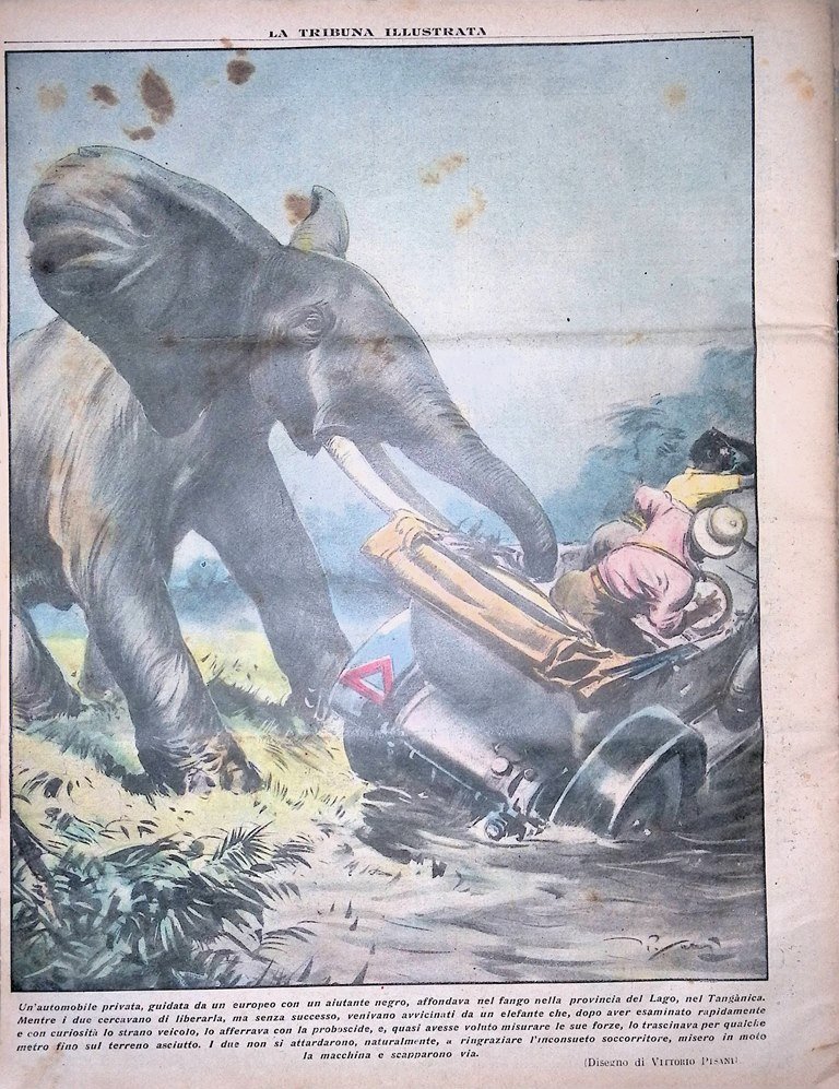 Un'automobile privata, guidata da un europeo con un aiutante negro, affondava nel fango nella provincia del Lago, nel Tanganica. Mentre i due cercavano di liberarla, ma senza successo, venivano avvicinati da un elefante che, dopo aver esaminato rapidamente e con curiosità lo strano veicolo, lo afferrava con la proboscide, e, quasi avesse voluto misurare le sue forze, lo trascinava per qualche metro fino sul terreno asciutto. I due non si attardarono, naturalmente, a ringraziare l'inconsueto soccorritore, misero in moto la macchina e scapparono via (disegno di Vittorio Pisani)