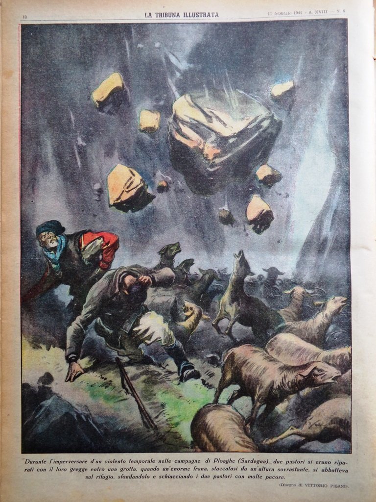 Durante l'imperversare d'un violento temporale nelle campagne di Ploaghe (Sardegna), due pastori si erano riparati con il loro gregge entro una grotta, quando un'enorme frana, staccatasi da un'altura sovrastante, si abbatteva sul rifugio, sfondandolo e schiacciando i due pastori con molte pecore (disegno di Vittorio Pisani)
