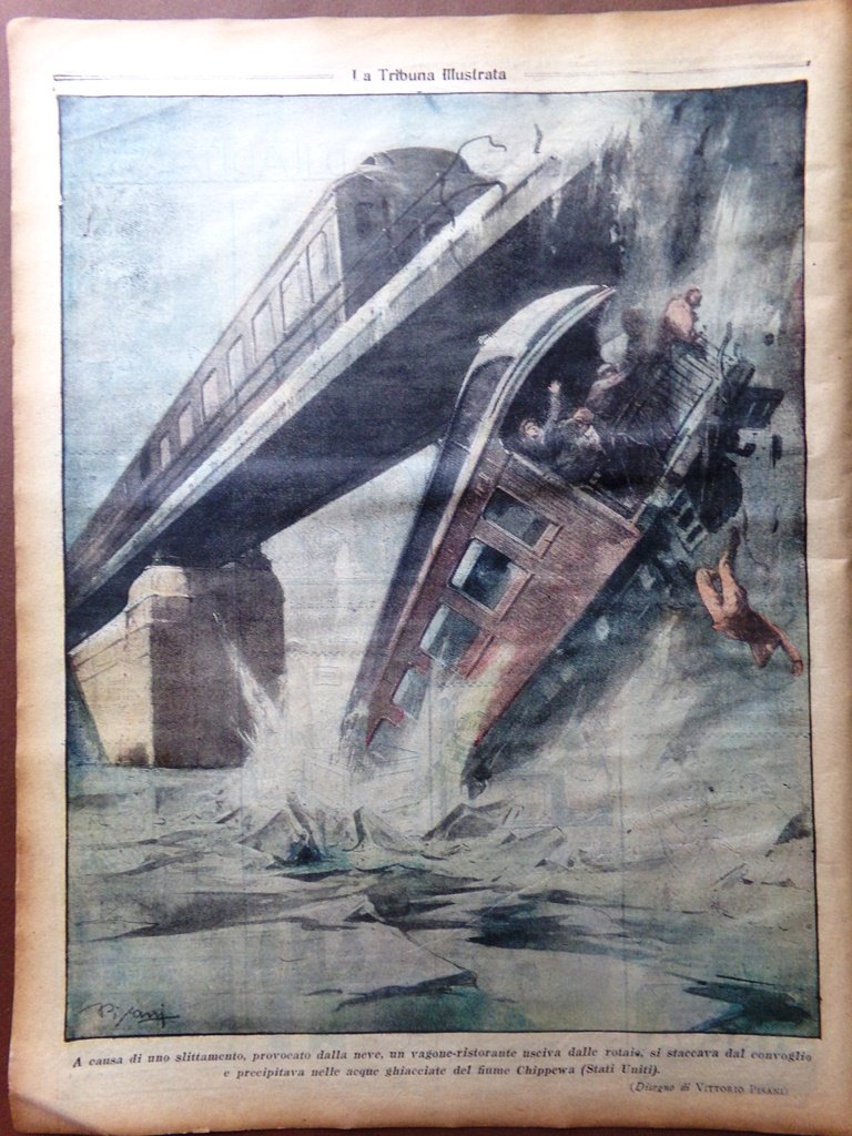 A causa di uno slittamento, provocato dalla neve, un vagone-ristorante usciva dalle rotaie, si staccava dal convoglio e precipitava nelle acque ghiacciate del fiume Chippewa (Stati Uniti) (disegno di Vittorio Pisani)