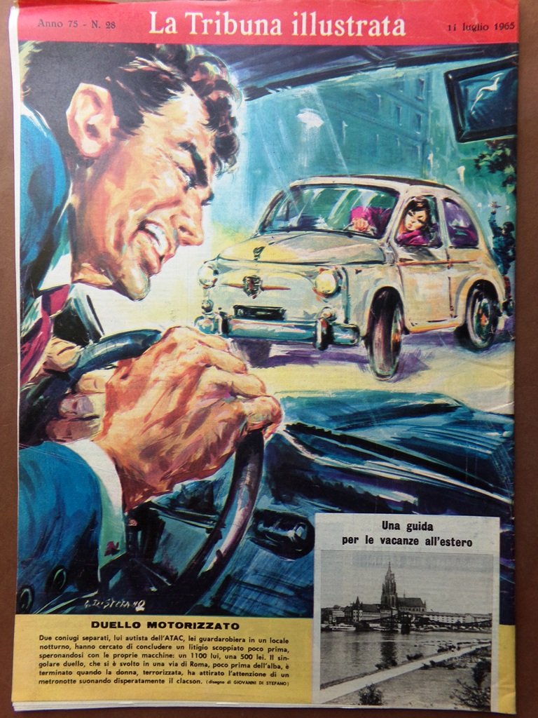 Due coniugi separati, lui autista dell'ATAC, lei guardarobiera in un locale notturno, hanno cercato di concludere un litigio scoppiato poco prima, speronandosi con le proprie macchine: un 1100 lui, una 500 lei. Il singolare duello, che si è svolto in una via di Roma, poco prima dell'alba, è terminato quando la donna, terrorizzata, ha attirato l'attenzione di un metronotte suonando disperatamente il clacson (disegno di Giovanni Di Stefano)