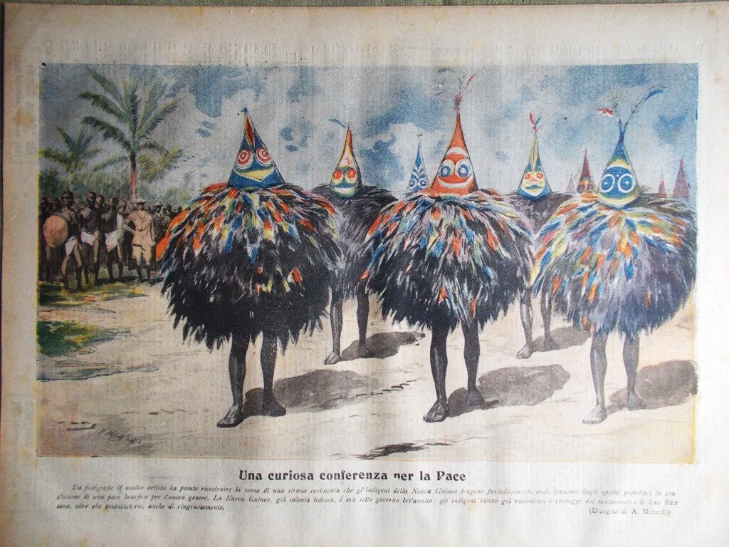 Una curiosa conferenza per la pace: strana cerimonia che gli indigeni della Nuova Guinea tengono periodicamente per invocare gli spiriti protettori al fine di avere una pace benefica per il genere umano (disegno di A. Minardi)