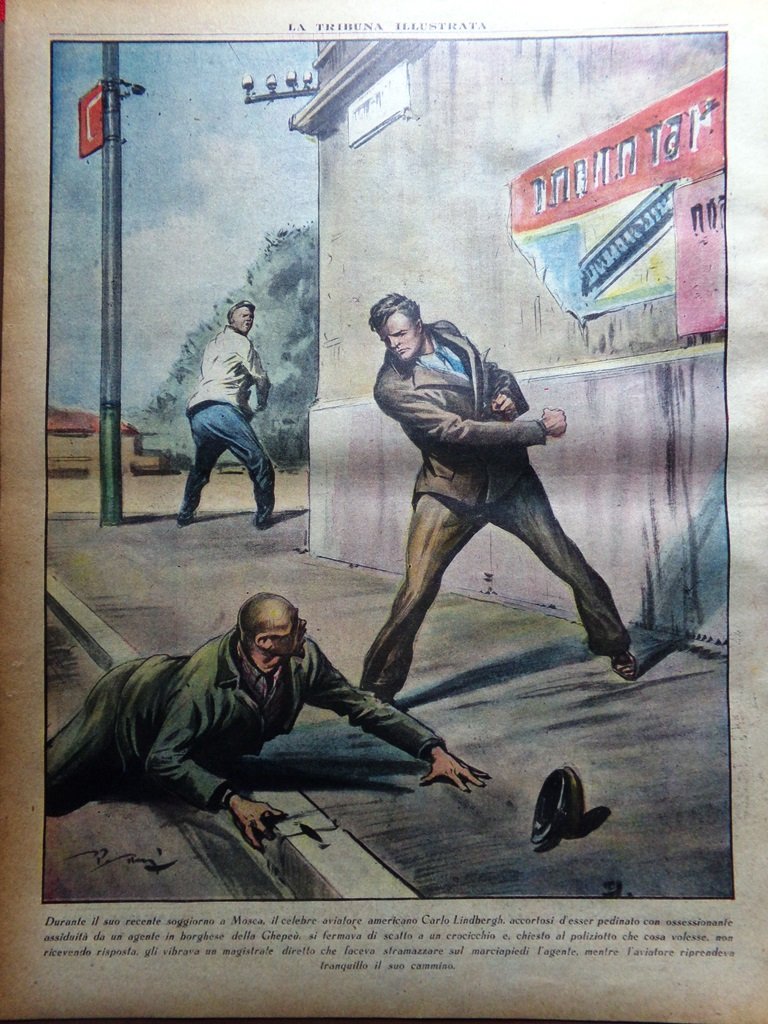Durante il suo recente soggiorno a Mosca, il celebre aviatore americano Carl Lindbergh, accortosi d'esser pedinato con ossessionante assiduità da un agente in borghese della Ghepeù, si fermava di scatt oa un crocicchio e, chiesto al poliziotto che cosa volesse, non ricevendo risposta, gli vibrava un magistrale diretto che faceva stramazzare sul marciapiedi l'agente, menter l'aviatore riprendeva tranquillo il suo cammino (disegno di Vittorio Pisani)