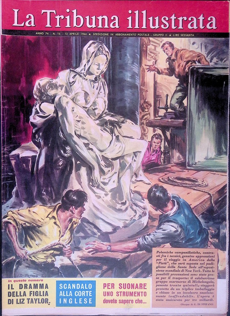 Polemiche campanilistiche, contrasti fra i tecnici, genuine apprensioni per il viaggio in America della "Pietà", che sarà esposta nel padiglione della Santa Sede all'esposizione mondiale di New York. Tutte le possibili precauzioni sono state prese per il trasporto: il celeberrimo gruppo marmoreo di Michelangelo, pesante trenta quintali, viaggerà protetto da un triplice imballaggio e chiuso in un involucro assolutamente inaffondabile. L'opera è stata assicurata per tre miliardi.